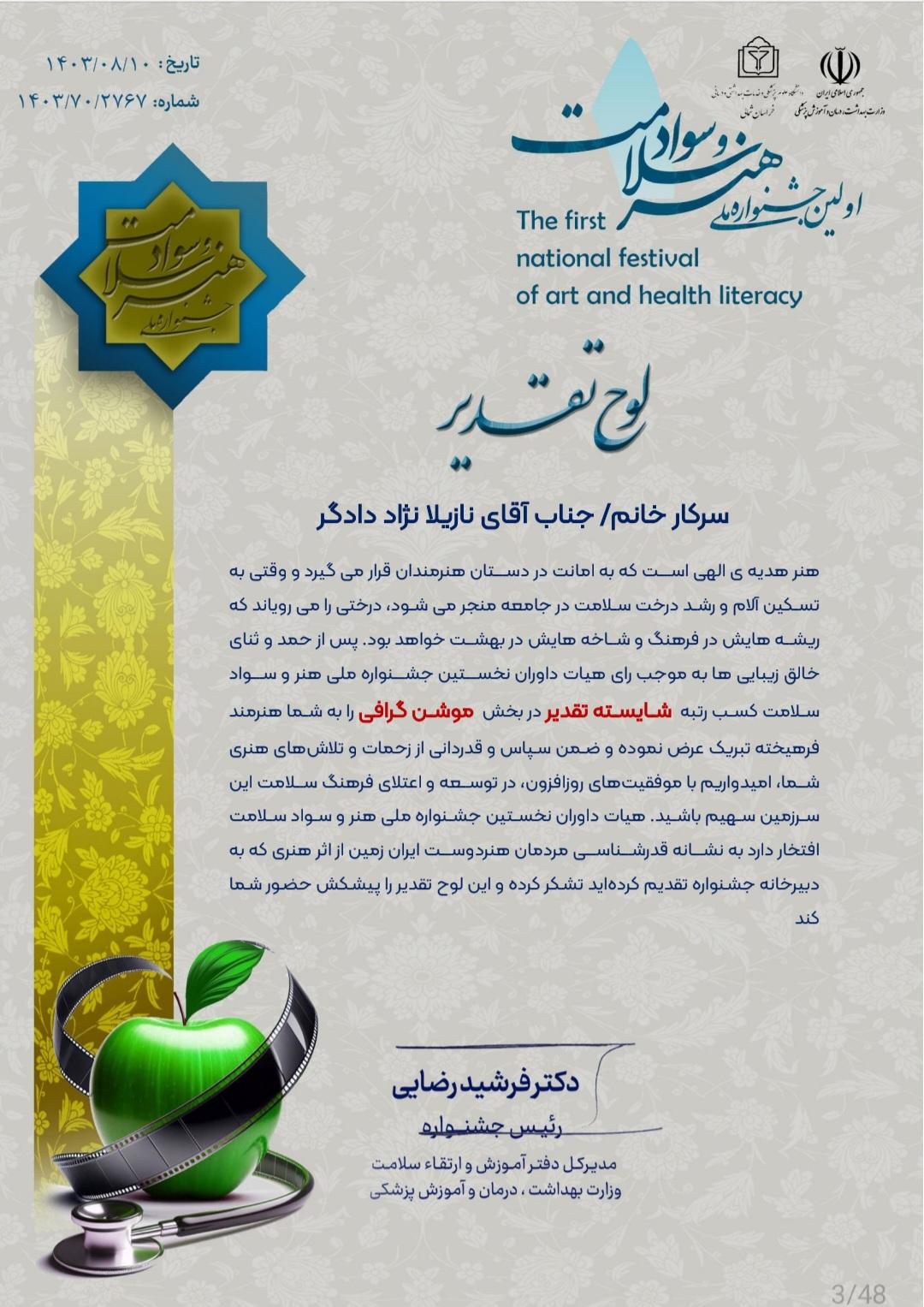 افتخارآفرینی در "اولین رویداد ملی هنر و سواد سلامت" توسط سرکار خانم دکتر نازیلا نژاددادگر ، عضو محترم شورای پژوهشی مرکز تحقیقات عوامل اجتماعی موثر بر سلامت را تبریک عرض نموده و برای ایشان آرزوی سلامتی و توفیق روز افزون داریم.
